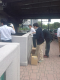 午前10時30分から神田橋、錦橋でEM団子600個を投入。東京海上日動火災保険の本社のボランティア総勢300名が大手町の街路の清掃時にEM団子を投入していただきました。